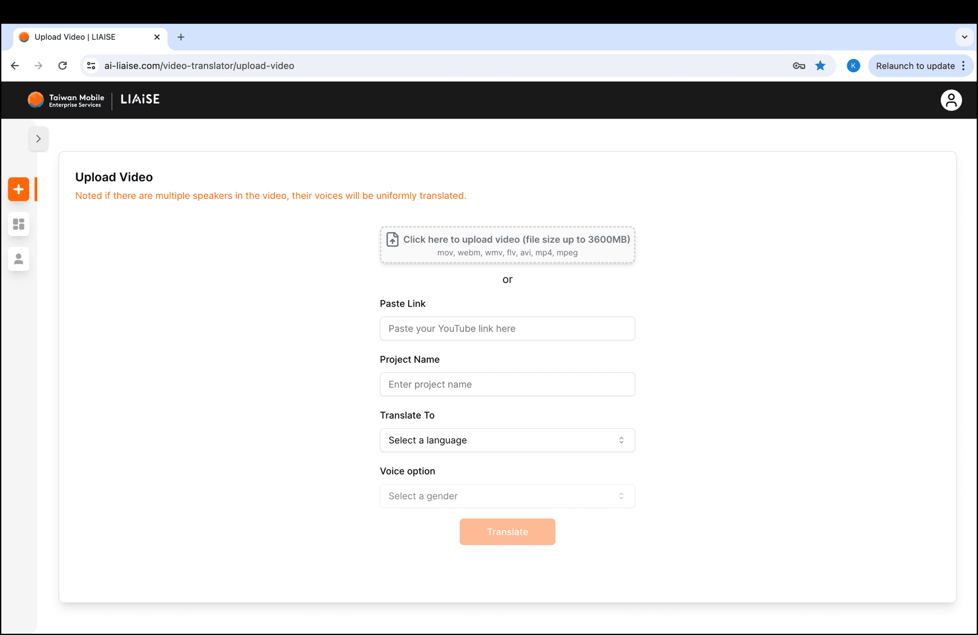 There are two options you can upload video to LIAISE, from your computer, and from Youtube. If you want to upload the video from a youtube link, simply copy and paste the link right here, and LIAISE will go and get that video. Then go ahead and start naming our video project and change the target language you want to translate it to. Lastly, select the voiceThere are two options for uploading videos to LIAISE: from your computer or from YouTube. To upload a video from a YouTube link, simply copy and paste the link into the designated area, and LIAISE will retrieve the video. Next, go ahead and name your video project and choose the target language for translation. Lastly, select the voice option. For each supported language, LIAISE offers two voice options: a female voice and a male voice. Choose based on your preference. Personally, I will choose the male voice to align with the original video. option. For each language LIAISE supports, it offers two voice options, a female voice and a male voice. You can select this based on your preference. For me, I am gonna choose male voice just to make it align to the original video.
