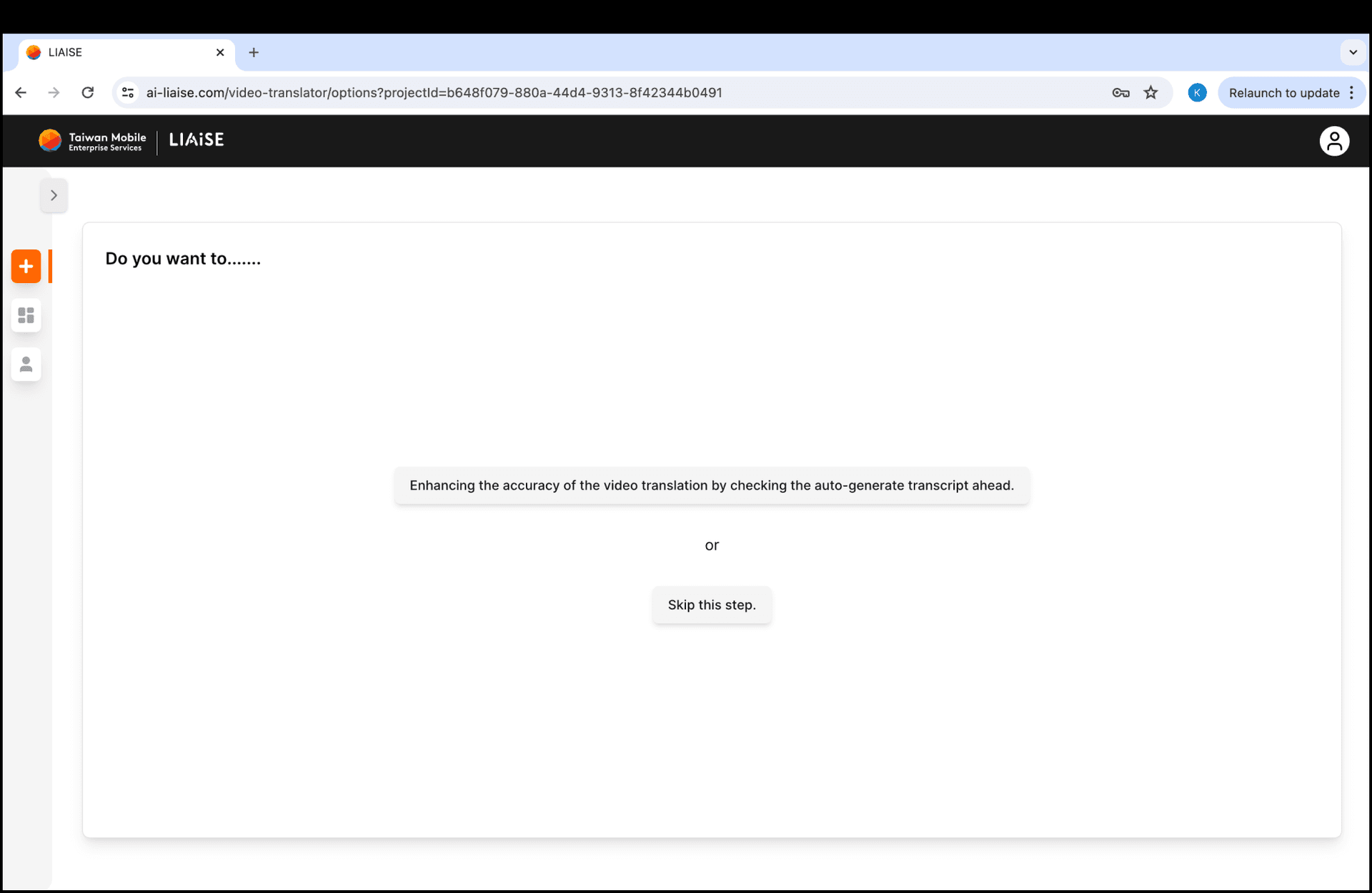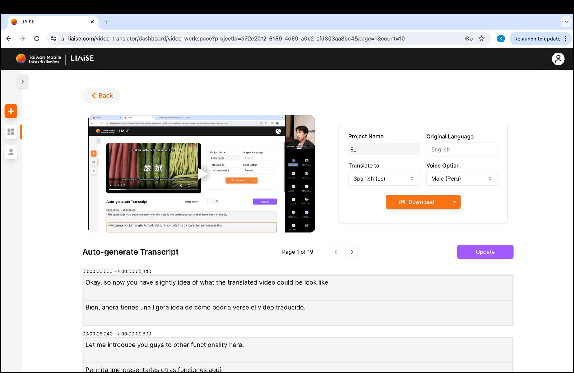 - Modify Transcript: In this section, you can modify the video transcript. Edit text directly by clicking on it. If LIAISE detects changes, an icon will appear at the end of the editing bar. Click on it to automatically translate the modified text. You can also refine translated text for accuracy. Once editing is complete, click "update" to apply changes to the transcript and video.